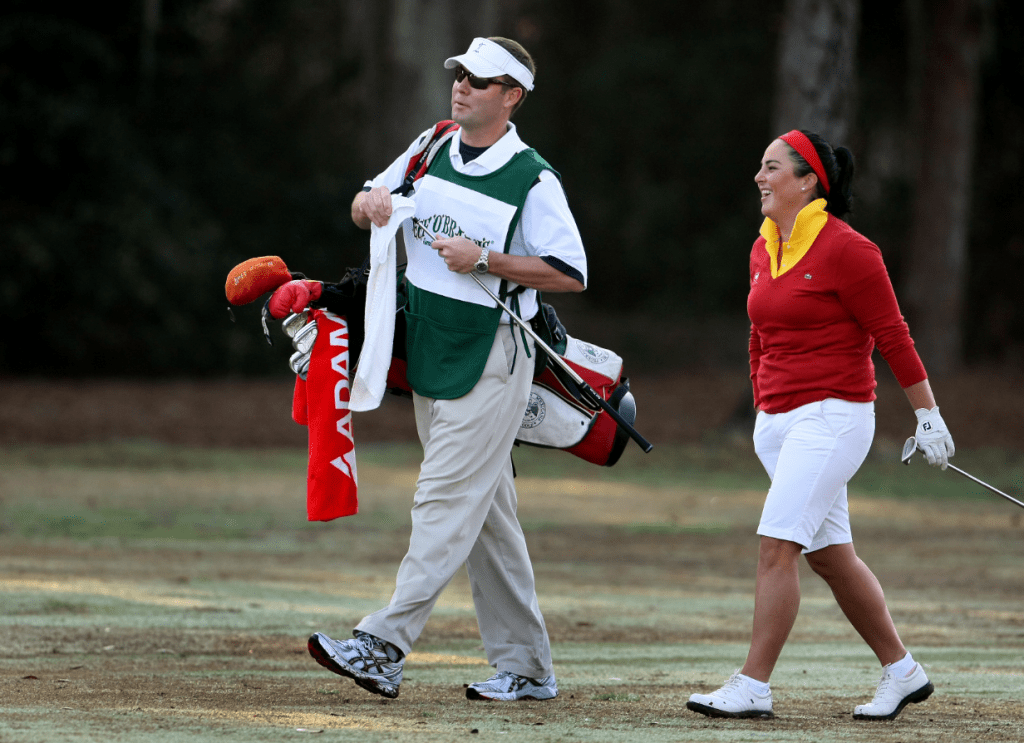 Caption: LPGA Commissioner Mike Whan caddies for Lili Alvarez during the Florida’s Natural Charity Classic.