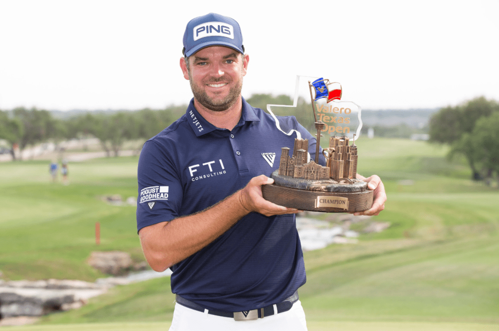 Corey Conners poses with the winner’s trophy following the final round of the Valero Texas Open at TPC San Antonio. (Photo: Raymond Carlin III-USA TODAY Sports)
